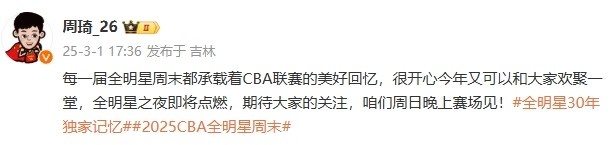 赛前,周琦发博展望比赛,并写道:“每一届全明星周末都承载着CBA联赛的美好回忆,很开心今年又可以和大家欢聚一堂,全明星之夜即将点燃,期待大家的关注,咱们周日晚上赛场见。”