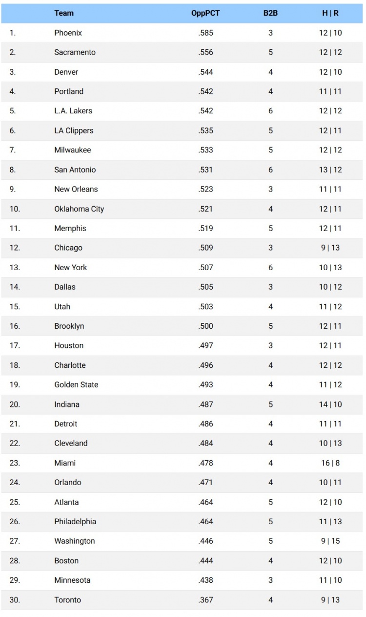 菲尼克斯太阳:剩余赛程对手累计胜率排名联盟最高,22场比赛中有19场是对阵目前胜率超过50%的16支球队,太阳对阵这16支球队目前的战绩为11胜20负。好消息是,太阳是唯一一支没有剩余休息劣势比赛的球队。