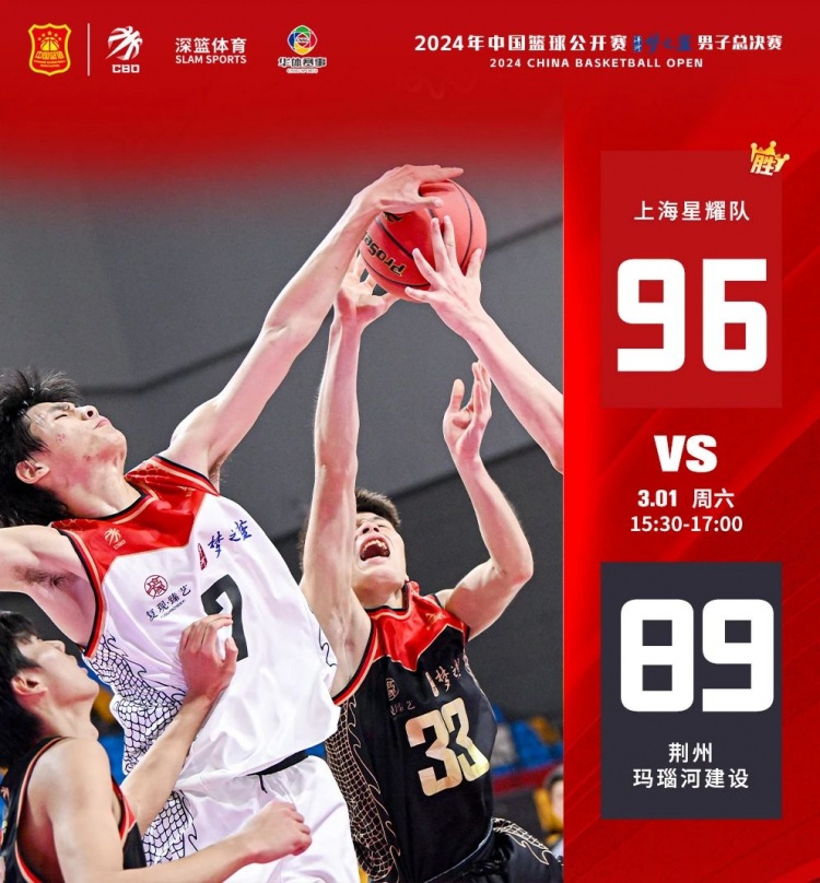 本场比赛两队打得相对胶着,上半场13平后,1号易世杰、35号李帅逸首节发挥出色,荆州玛瑙河建设取得领先。次节,上海星耀拼抢更加主动此后两队比分紧咬,始终没有拉开。下半场,上海星耀在第三节节末逐渐将分差拉开,以74-68领先。落后的荆州玛瑙河建设进攻节奏稍显紊乱,但很快调整过来,通过快速反击,咬住比分。上海星耀随即稳住局面,放慢进攻节奏,最终上海星耀96-89战胜荆州玛瑙河建设。