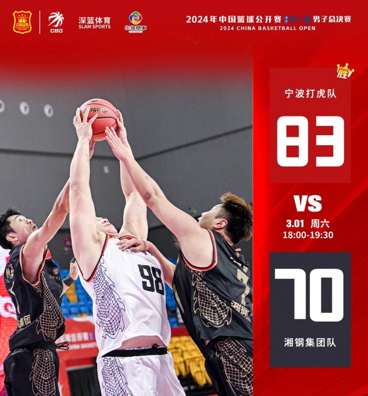 上半场,宁波打虎开场通过外线远投和98号王宇在内线的强大统治力,打出一波14-0的得分潮。湘钢集团手感欠佳,命中率不高,半场结束,宁波打虎50-27领先湘钢集团。下半场,湘钢集团状态有一定提升,但面对宁波打虎的防守,自身失误较多。最终,宁波打虎83-70战胜湘钢集团。
