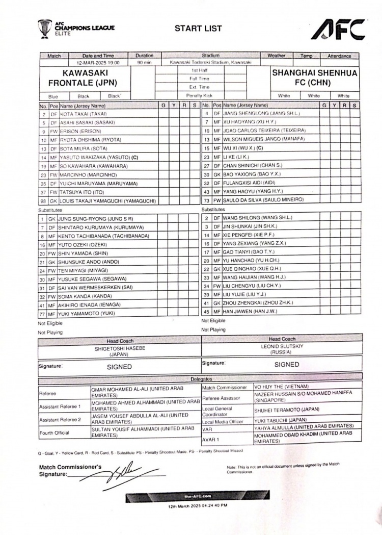 2025-03-12 20:11:06亚冠精英联赛1/8决赛次回合 川崎前锋vs上海申花首发名单
