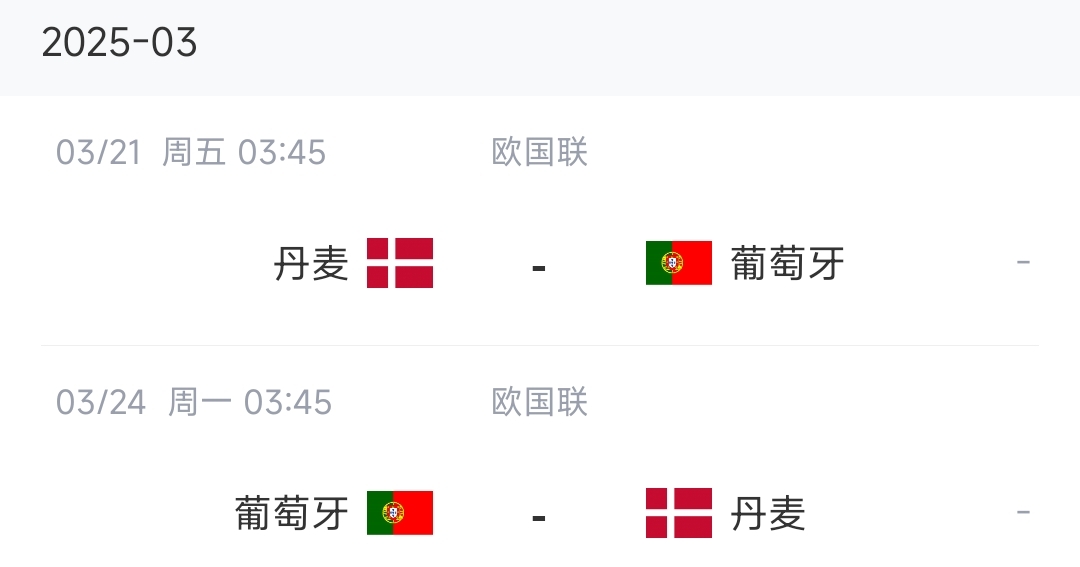3月份国际比赛日中,葡萄牙将在欧国联1/4决赛迎来与丹麦队的两回合比赛,比赛时间为3月21日和3月24日,葡萄牙先客后主。