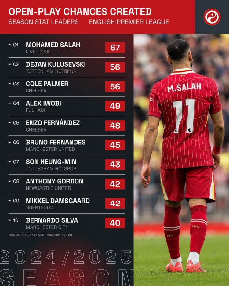 2025-03-19 10:11:28本赛季英超运动战创造机会榜:萨拉赫居首,帕尔默、B费、B席在列