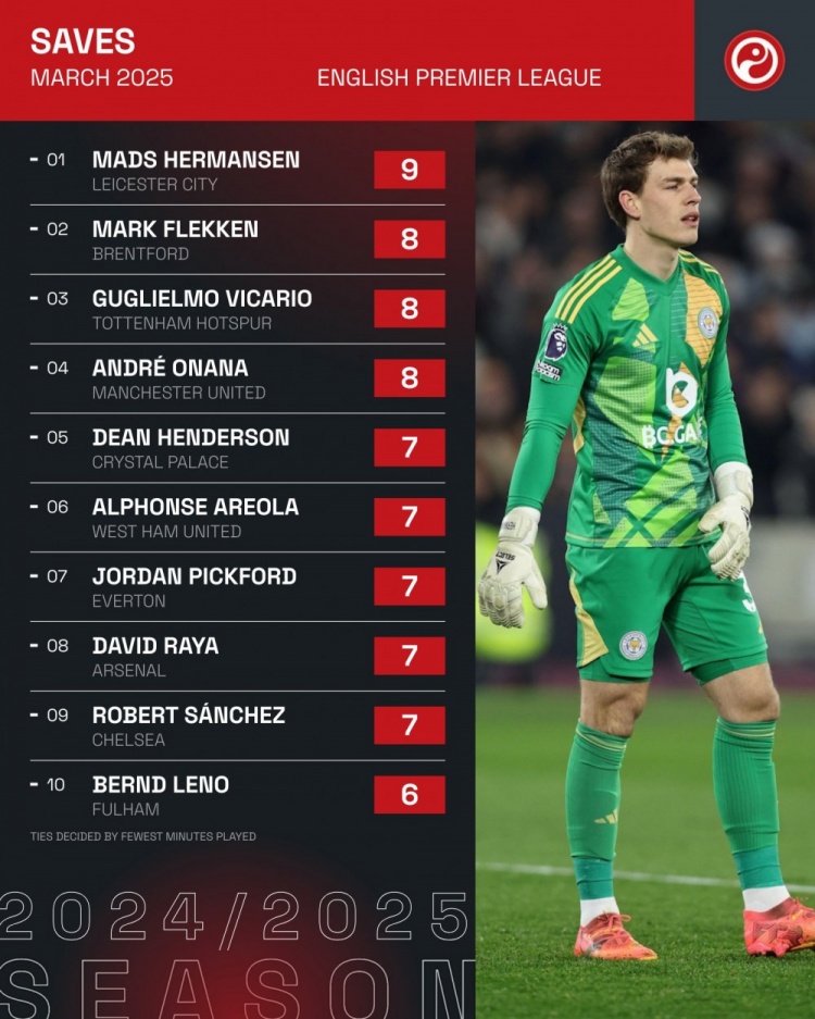 2025-04-01 14:37:16英超3月扑救次数排名:赫尔曼森9次居首,奥纳纳8次&拉亚7次