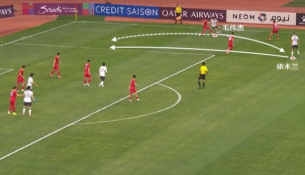 依木兰最被球迷津津乐道的一幕,就是发生在跟卡塔尔U20的比赛里。当时依木兰用一个布斯克茨式转身完成变向,随后送出直塞球给到队友陈泽仕,带来了随后的反击机会。