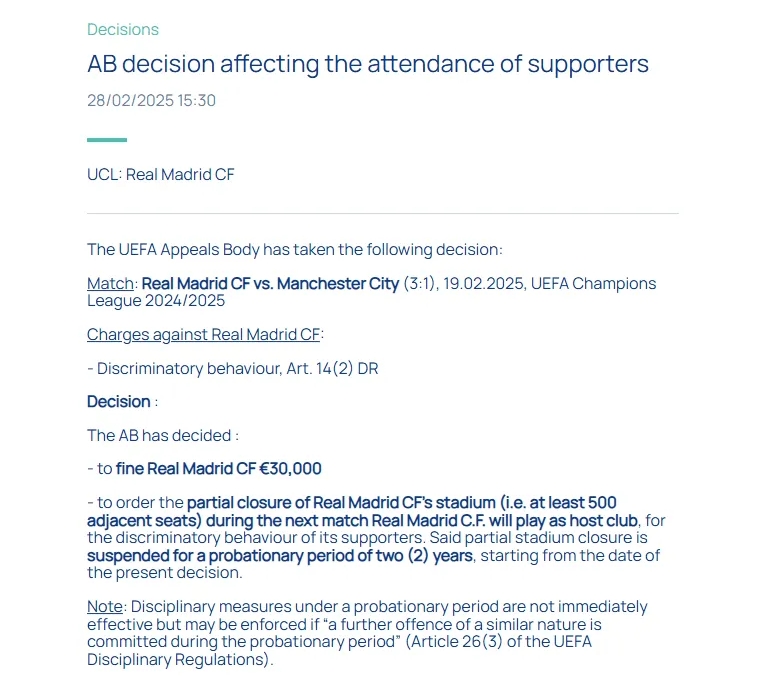 这一“有条件处罚”机制意味着,只有当皇马球迷在2026年2月前再次被证实存在歧视行为时,伯纳乌球场才会实际执行看台关闭措施。欧足联在声明中强调,该裁决体现了对歧视行为“零容忍但给予改正机会”的双重原则。