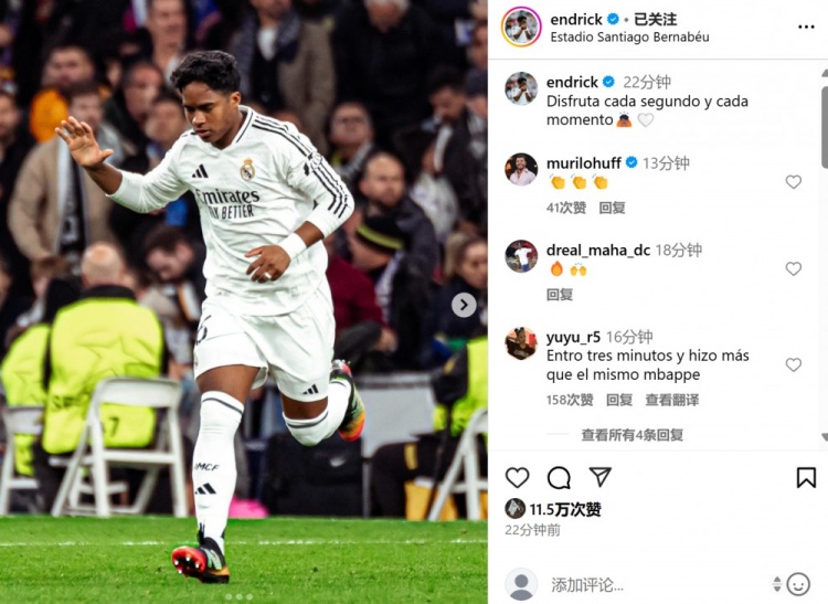 2025-03-05 07:19:38替补登场迎欧冠淘汰赛首秀,恩德里克社媒晒照:享受比赛每个瞬间